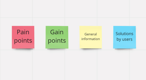 In total, we interviewed 33 people interested in pets, and obtained more than 200 pieces of information that we divided into pain points (red), gain points (green), relevant facts without value judgment (yellow) and solutions offered by users (blue).